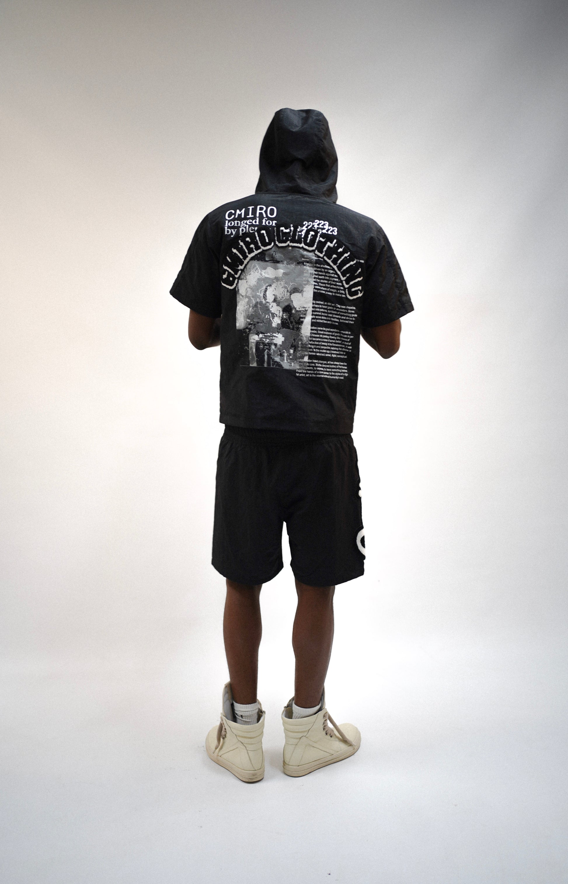 This short-sleeve top blends utilitarian detailing with bold streetwear energy. Crafted from textured nylon, it features a clean silhouette with functional silver zipper, oversized hood, and subtle Cmiro™ branding. Whether you wear it layered or solo, this top brings sharp structure and effortless movement to any fit.
