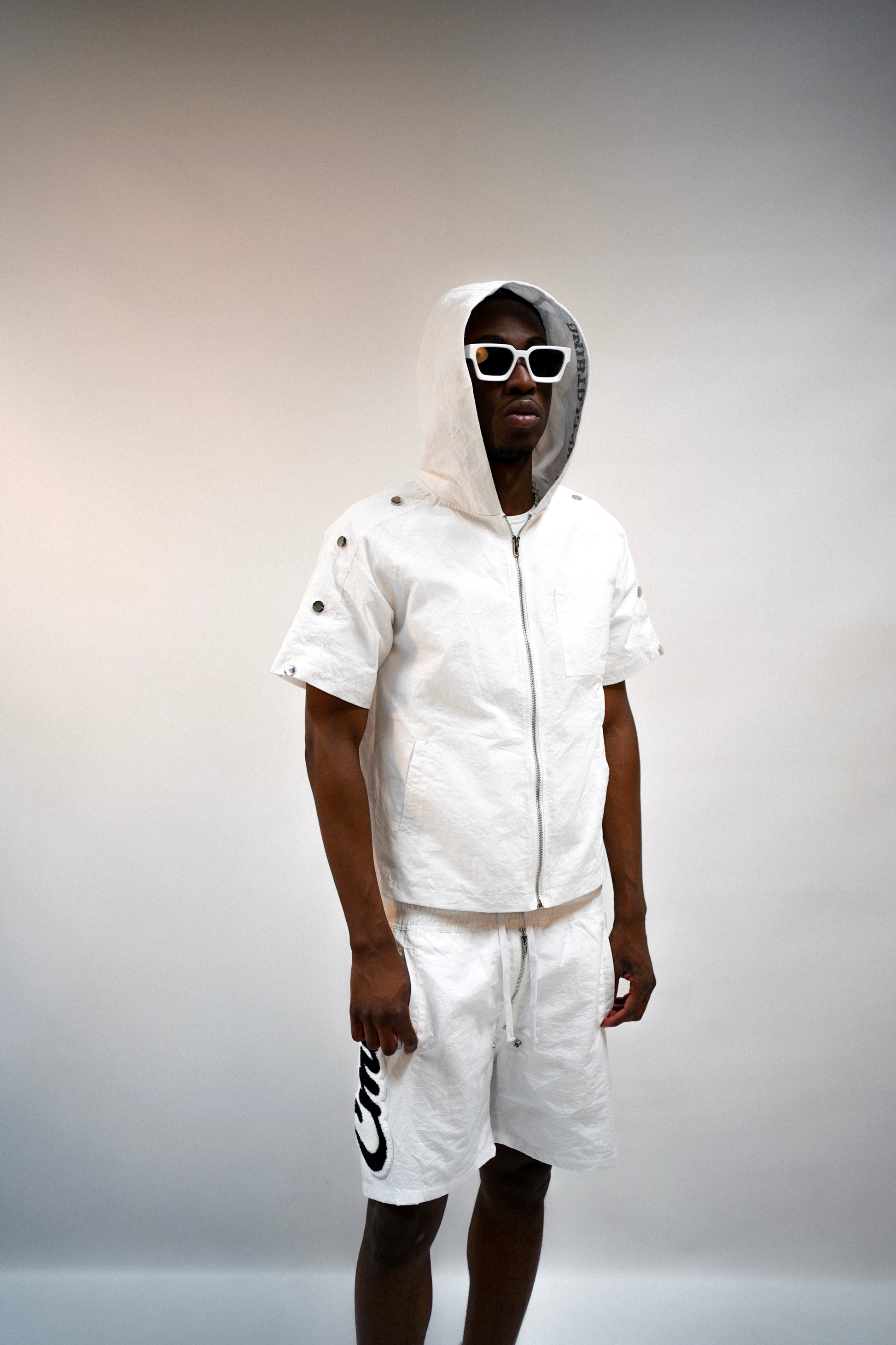 This short-sleeve top blends utilitarian detailing with bold streetwear energy. Crafted from textured nylon, it features a clean silhouette with functional silver zipper, oversized hood, and subtle Cmiro™ branding. Whether you wear it layered or solo, this top brings sharp structure and effortless movement to any fit.